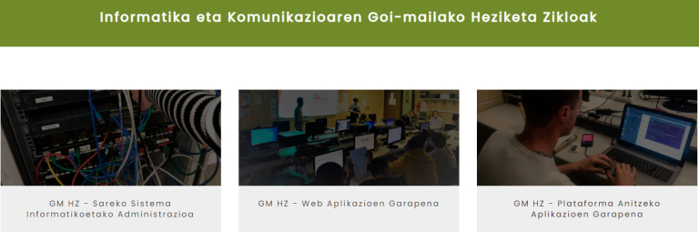 - Informatika eta Komunikazioak lanbide-arloko zeharkako prestakuntzaren bidez, goi-mailako heziketa-zikloetan lantzen da: Web Aplikazioen Garapena, Plataforma Anitzeko Aplikazioen Garapena eta Sareko Sistema Informatikoen Administrazioan.