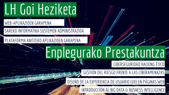 Zibersegurtasunari buruzko informazioa zabaldu nahi badezu, gure zibersegurtasuneko adituari egindako azken elkarrizketa osoa ikusi ahal izango duzu, diariovasco.com aldizkariaren argitalpenera sartuz. Goi-mailako Lanbide Heziketaren eskaintza ezagutu nahi baduzu, web aplikazioen garapena, Sareko informatika-sistemen administrazioa edo plataforma anitzeko aplikazioen garapena; gurekin kontaktuan jarri, zentrotik tourra egingo dizugu, gure metodologia eta ikasketa-plana azaltzeko.